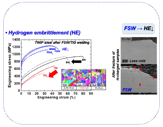 안전한 수소 에너지 공급을 위해서는 수소 저장 및 운반 소재의 안전성 평가가 핵심이다. 본 연구실에서는 용접 전 후, 수소 저장 및 운반 소재