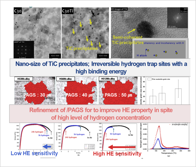 - 소재 성능 측면에서 TiC 나노 석출물이 수소 트랩 역할을 하여 HE 저항성을 향상시킴을 확인하였습니다.