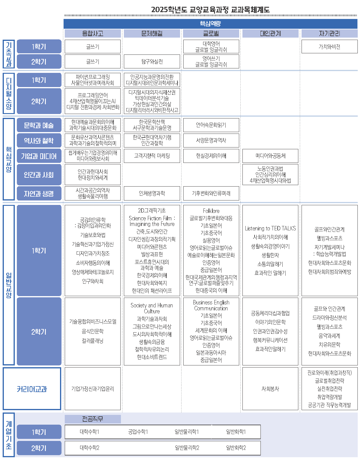 - 핵심교양은 문학과 예술, 역사와 철학, 기업과 미디어, 인간과 사회, 자연과 생명의 총 5개 영역으로 영역별 4개 교과(각 3학점)를 융합사고, 문제해결, 대인관계, 글로벌 4개 영역의 핵심역량이 골고루 함양되도록 편성하며, 교양선택으로 운영한다.
