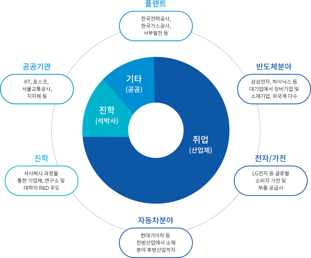 - 국내외 주요대기업와 중견중소기업에 고르게 진출하며, 연구소 및 대학원 진학이 활발합니다.