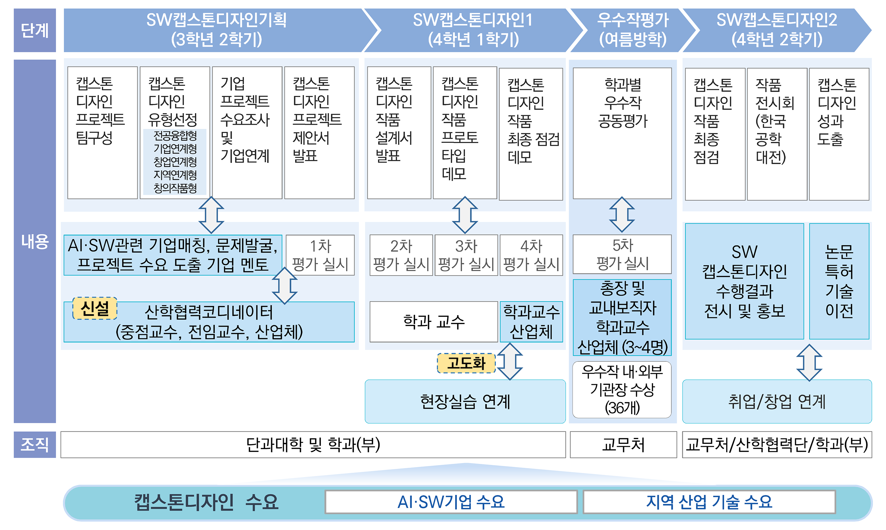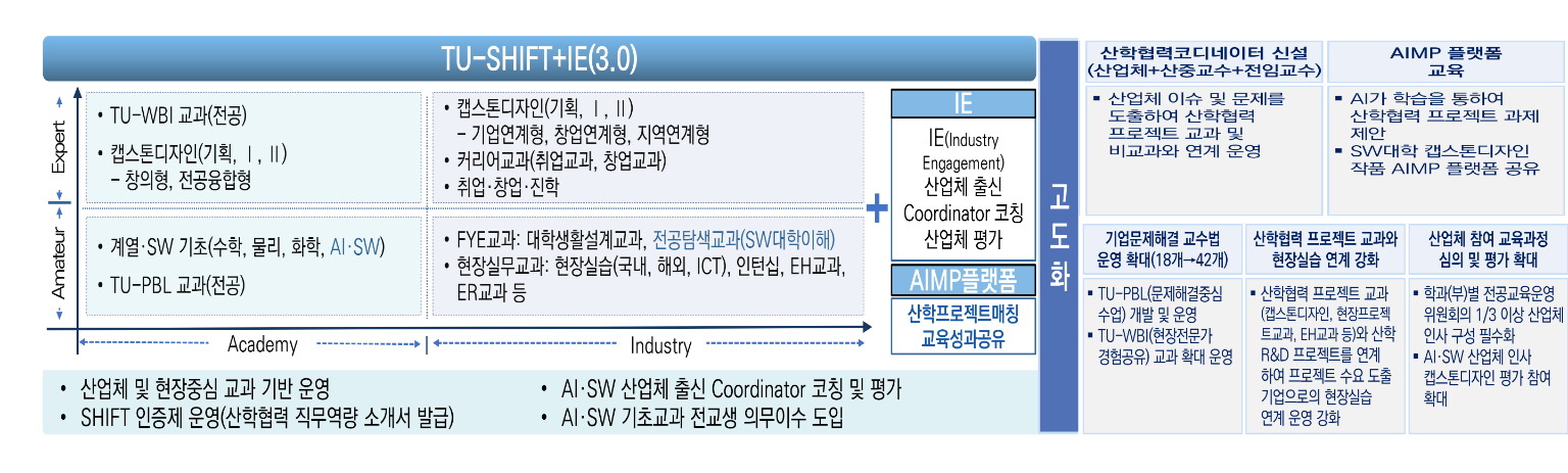 SW 교육과정 (SW전공 / SW융합) AI · SW 현장중심 산학협력 교육모델 (TU-SHIFT + IE) 고도화 산학협력코디네이터 신설, 현장실습연계 강화, 산업체 참여 교육과정 확대 등 캡스톤디자인 운영 고도화 캡스톤디자인 교과개편 (종합설계 →SW캡스톤디자인), 3학기 4학점 필수 산업체수여 기반 프로젝트 진행, 산업체전문가 평가 참여, 캡스톤경진대회 (한국공학대전)